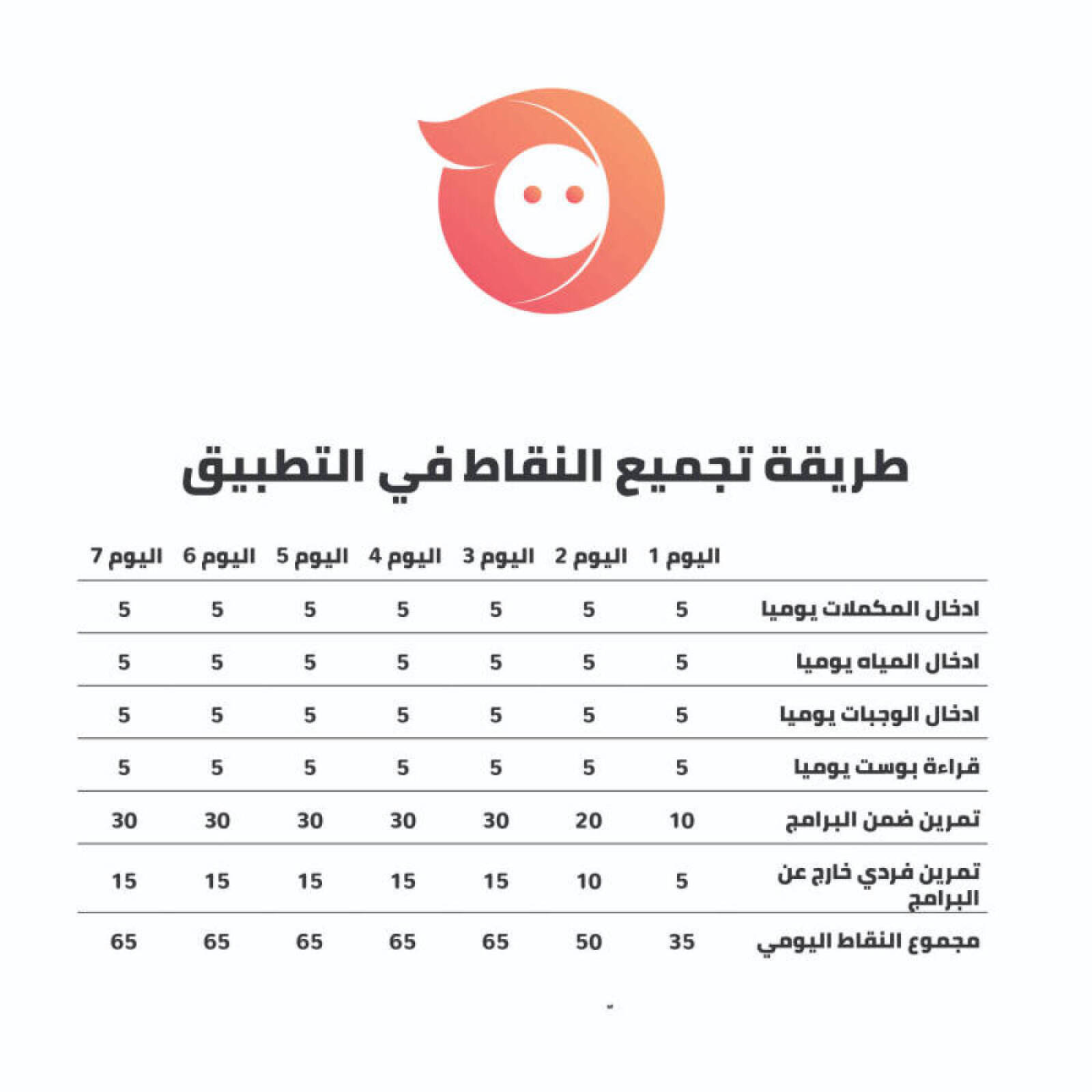 ٥. عن انتهاء تمرين من ضمن مكتبه التمرينات / المدربات يتم احتساب اليوم الاول 5 نقاط واليوم الثاني 10 نقاط واليوم الثالث وما يتبعه 15 نقطه