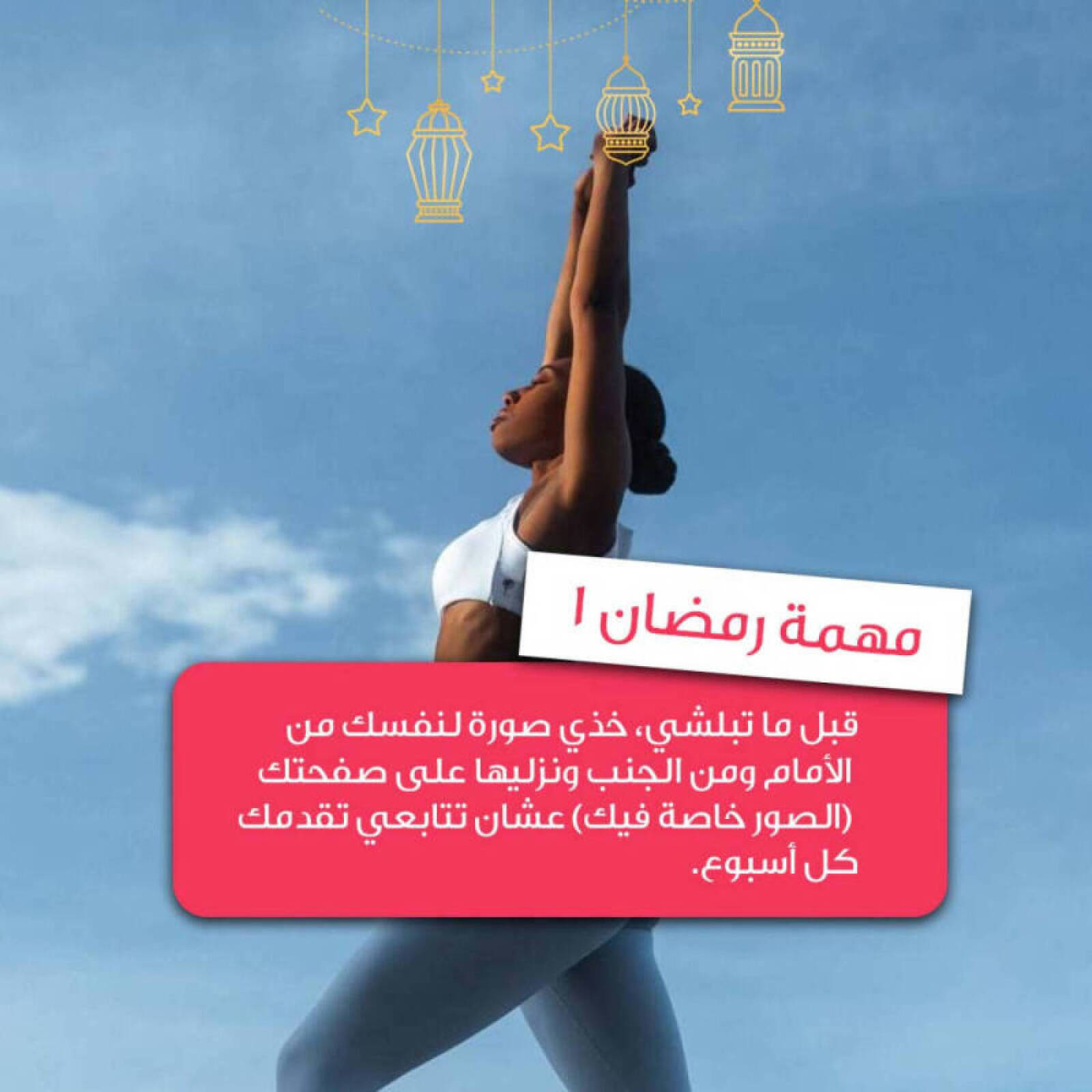 مهمة رمضان 1قبل ما تبلشي، خذي صورة لنفسك من الأمام ومن الجنب ونزليها على صفحتك (الصور خاصة فيك) عشان تتابعي تقدمك كل أسبوع.